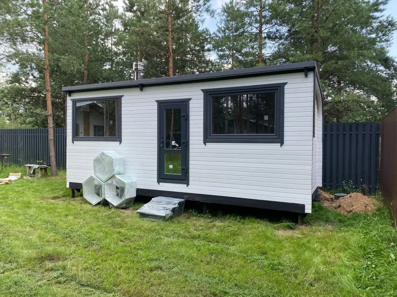 Идеальный вариант, если к месту установки может подъехать грузовая машина, а ширина бани не превышает 2.5 метра. Мы привезем уже собранную баню и установим её за 1 час.